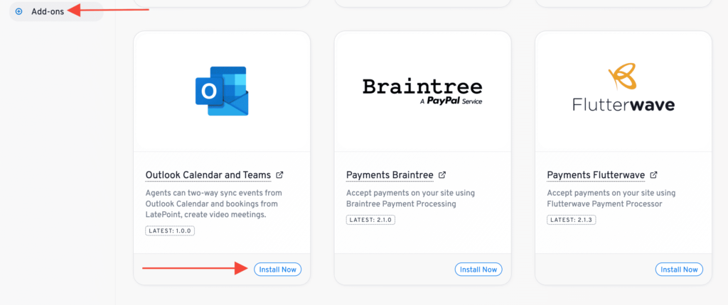 1. First step is to install and activate the Outlook Calendar and Teams Add-on. You can find it on the “Add-ons” page in your LatePoint admin: