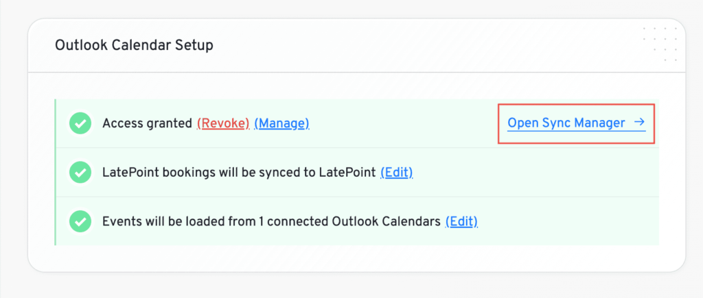 4. Once connected, you’ll be able to pick calendars it pulls and pushes events to and the box will change to green with a new link “Open Sync Manger”: