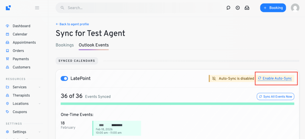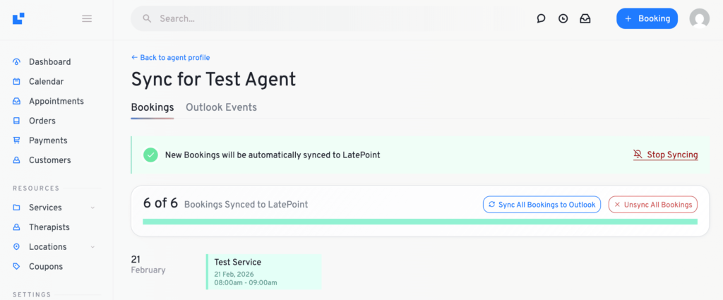 When you open the sync manager, you will see two tabs: Bookings in Latepoint and Outlook Calendar Events. First tab shows bookings of the selected agent in your LatePoint database, you can sync either all of them (Sync all bookings to Outlook link) or pick individually by clicking on a circular arrows icon next to each booking. Synced bookings will appear green.